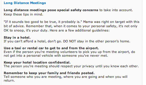 Wait a second, what?! WHAT??!! Long Distance Meetings? People are going on LONG DISTANCE MEETINGS? Are you insane? I hereby take back every snarky, obnoxious thing I have said about Match’s safety tips. I had no idea how necessary they are.
